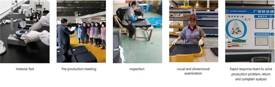 Ние сме целосно усогласени со ISO9001 за дизајн и производство на патосници за автомобили, ISO/TSI16949 за контрола на квалитетот, ISO14001:2015 за управување со животната средина, BSCI за општествена одговорност и ЕУ REACH стандарди за суровини. Имаме внатрешни капацитети за тестирање за да извршиме самопроверки за да обезбедиме нашите производи да ги поминат тестовите извршени од SGS, Intertek или кој било друг инспектор од трета страна што може да го бараат клиентите.